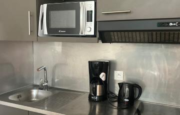 Dans les studios pouvant accueillir de 2 à 3 personnes, vous trouverez un séjour avec un coin cuisine équipé (frigo, micro-ondes, cafetière), une salle d’eau, des toilettes séparées et un couchage double, avec possibilité de lit d’appoint.